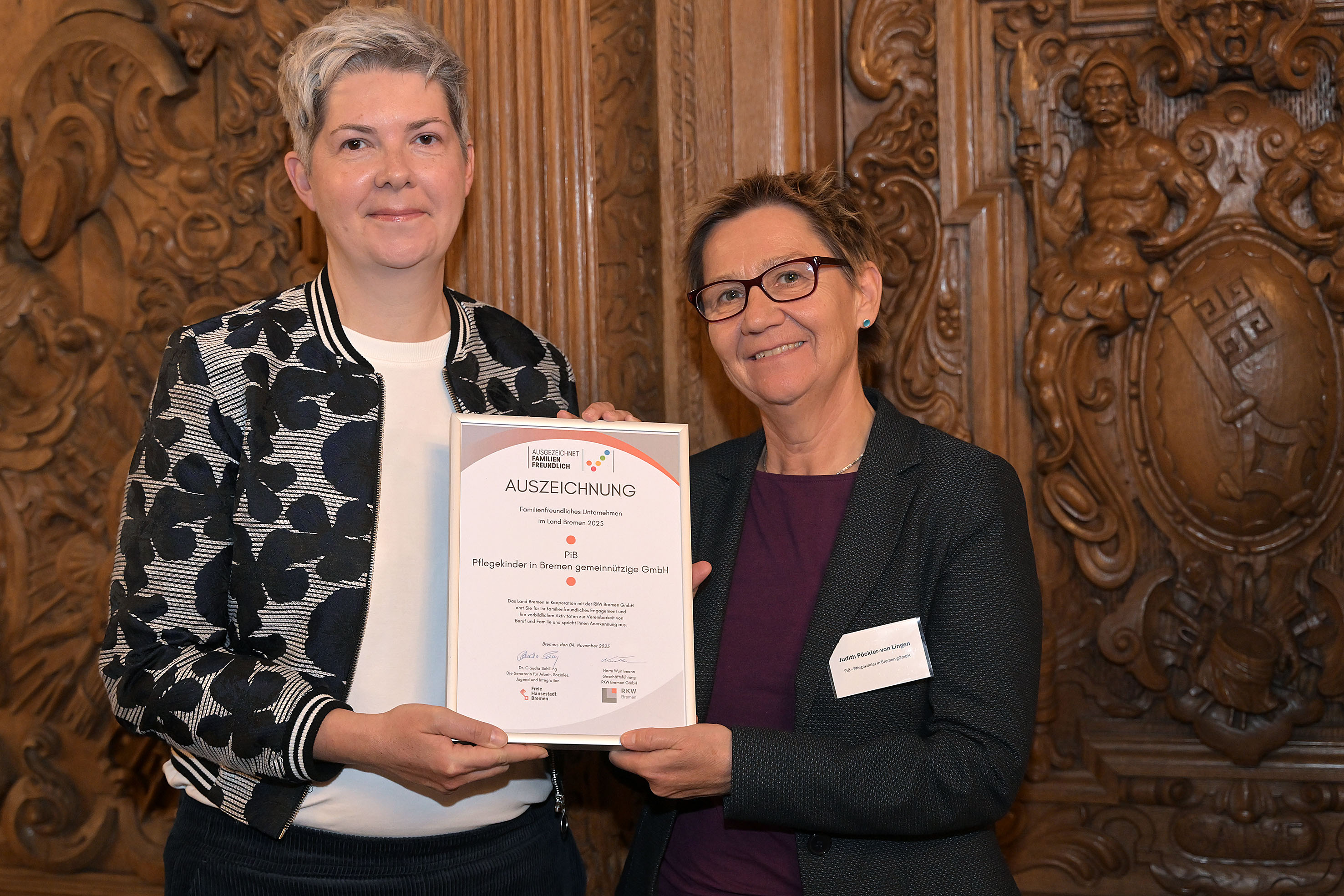 Die Arbeits- und Sozialsenatorin Claudia Schilling hat am 4. November familienfreundliche Unternehmen in Bremen ausgezeichnet und rezertifiziert, darunter erstmalig auch unser Mitglied PiB - Pflegekinder in Bremen.